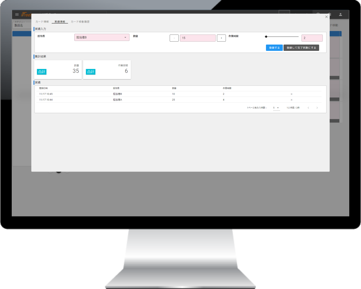 計画ボード画面で追加したカードに対して、実績を登録することができます。