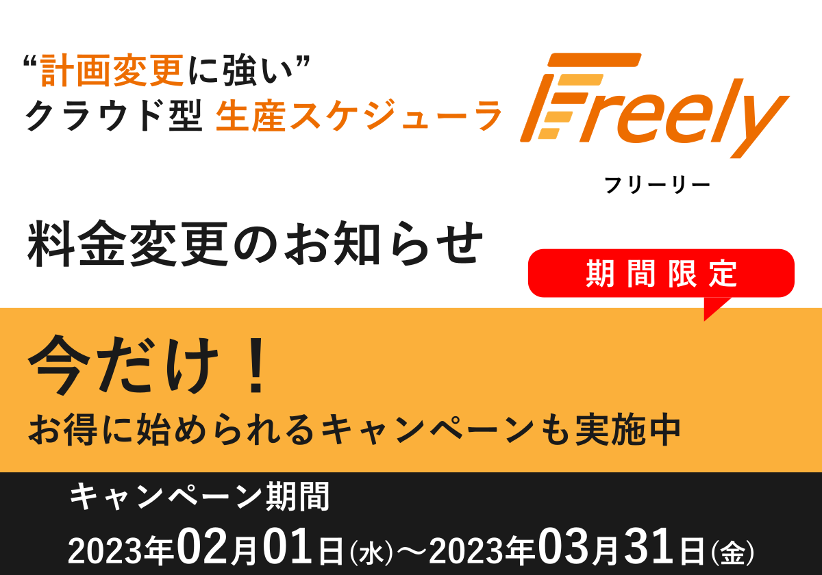 生産スケジューラFreelyの利用料金を 2024年04月01日より、下記の内容に変更する予定です。これに伴い、2023年03月31日までに有償版をご契約いただいた方に限り、改定前の料金体系でご利用いただけるキャンペーンを実施いたします。