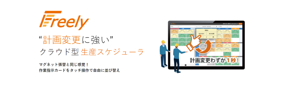 「生産スケジューラFreely(フリーリー)」は、多品種少量生産を行う製造業様におすすめなクラウド型の計画ボードです。 作業指示カードをタッチ操作で移動できるので、頻発する計画変更にも効率良く対応可能で、離れた場所でもリアルタイムに計画共有できます。