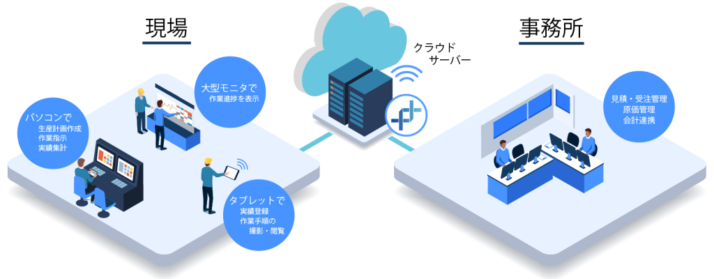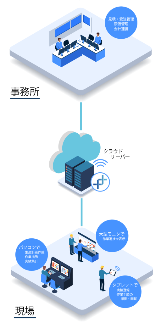 生産管理システムFUSEは、外部のクラウドサーバ環境もしくは、利用いただく企業様の社内に保有しているサーバ(オンプレミス)環境に導入してお使いいただきます。導入後は事務所や工場など離れた拠点でも同じシステムをご利用いただくことができます。