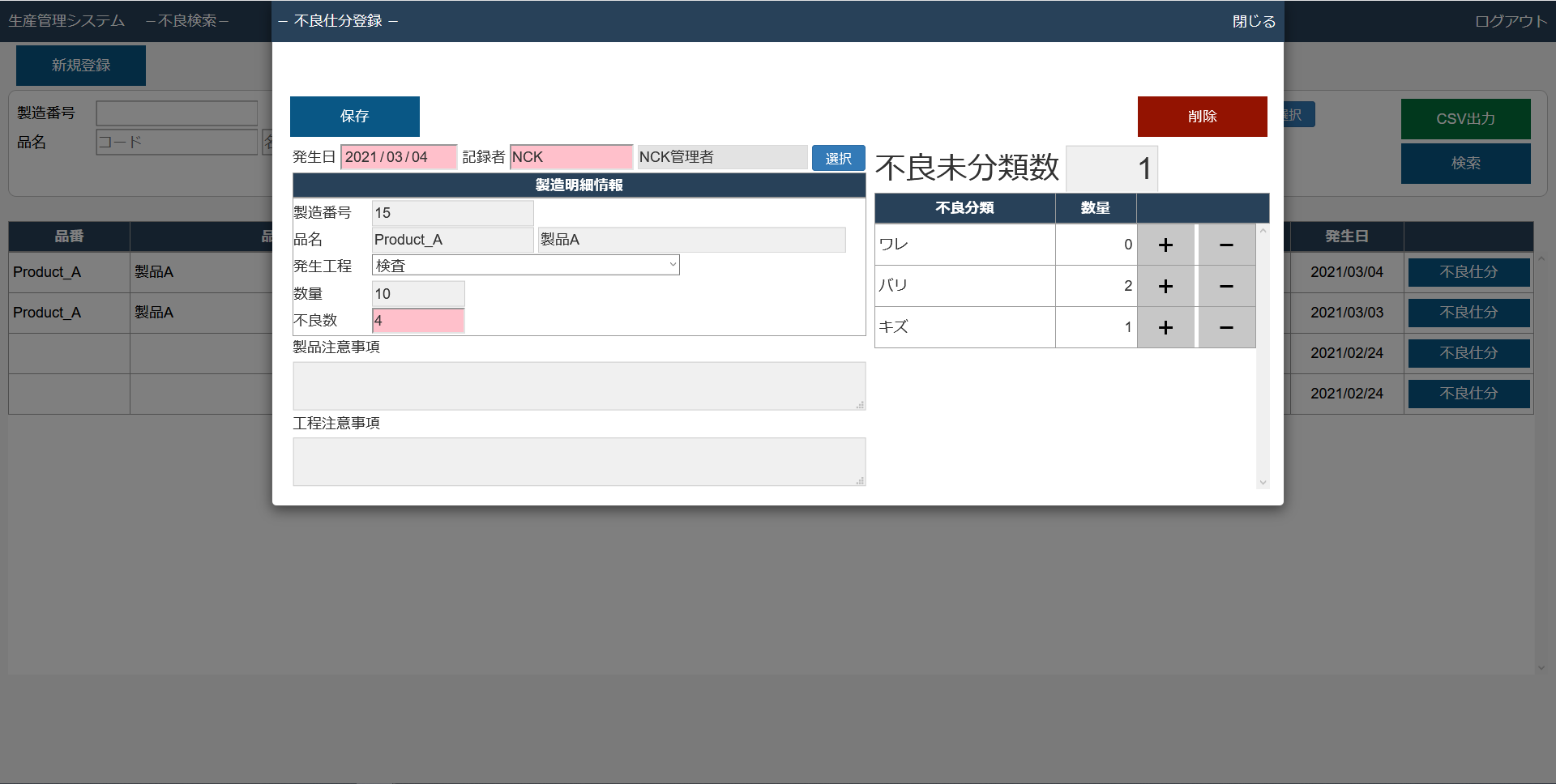 不良管理機能の画面イメージ