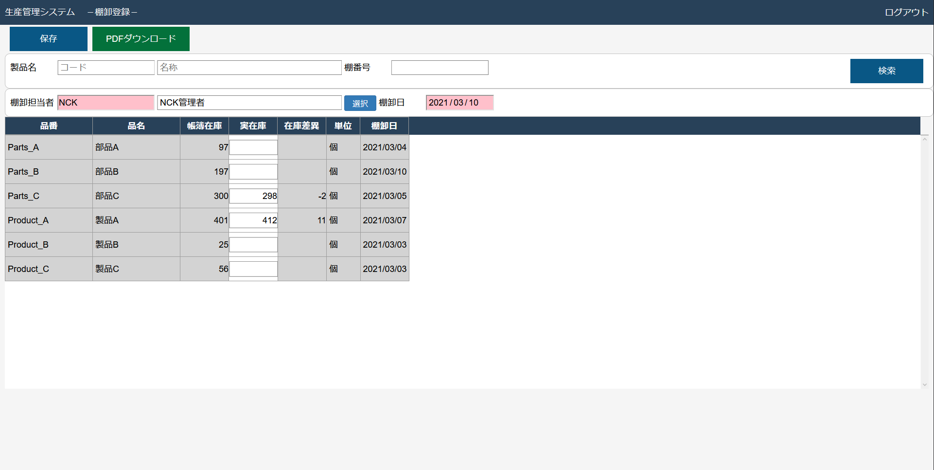 製品や部品毎の現在庫数を一覧で確認でき、そのまま入出庫登録を実施することが可能です。