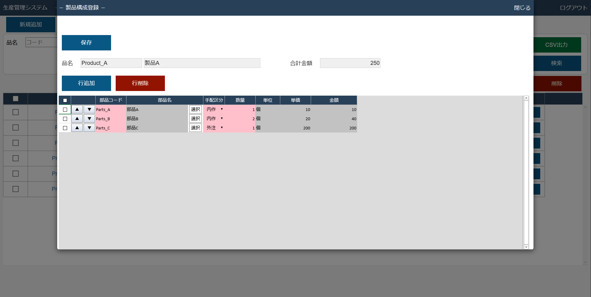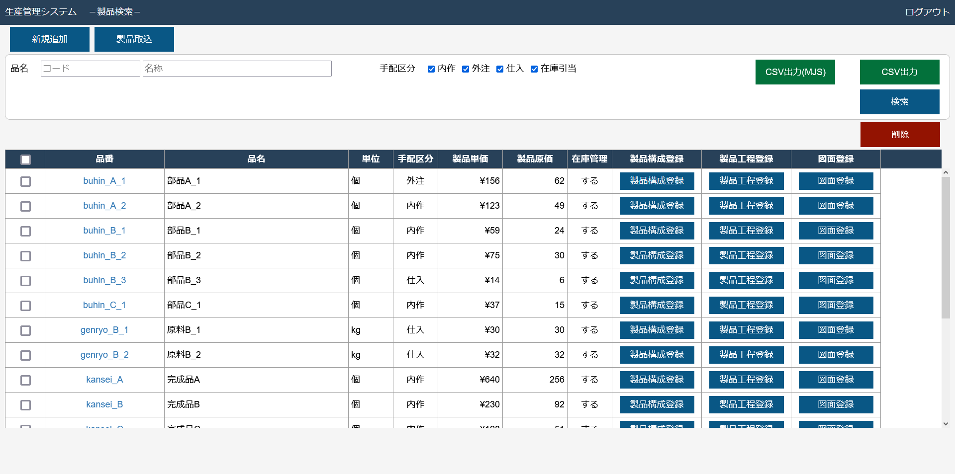 製品、構成部品、工程、顧客、社員などシステムを運用するために必要なマスタ情報を、手軽に登録/確認することができます。 カテゴリが細かく区分されており、1つ1つのマスタの項目も少ないため、マスタ自体の登録やメンテナンスを行う手間が少ないことが特徴です。 また製品工程マスタでは、工程毎に使用機械や標準作業時間を登録できるため、機械の負荷状況や作業原価の算出などが円滑に行えます。